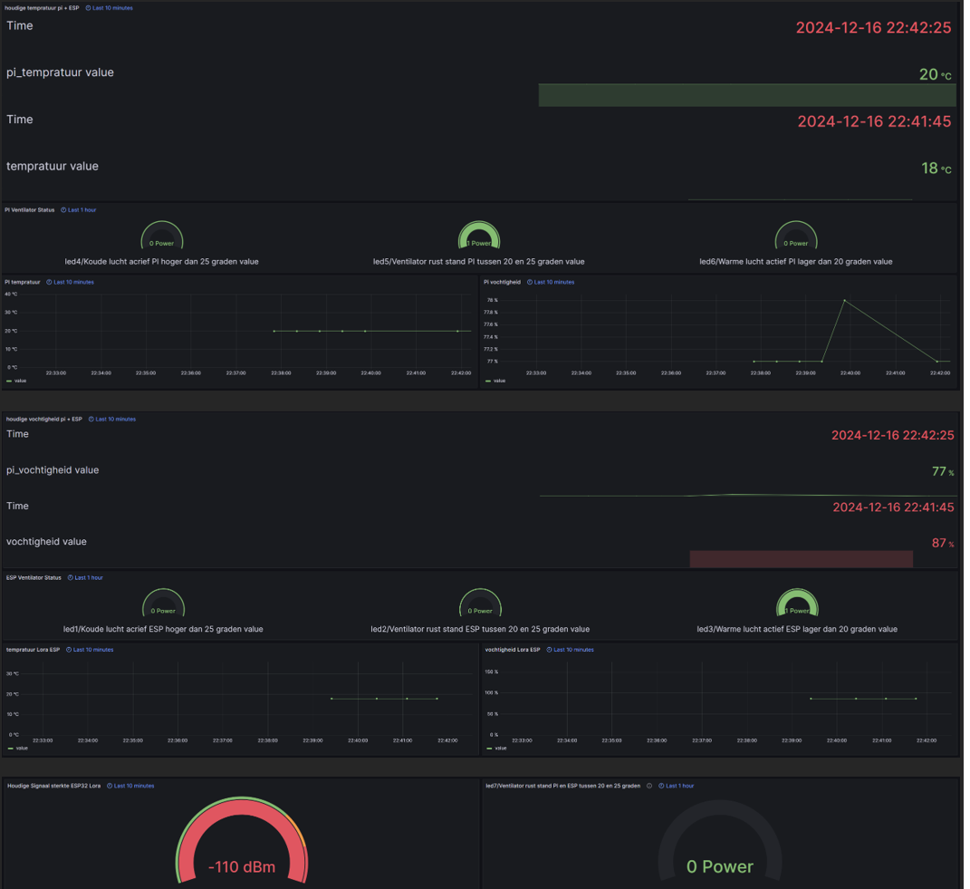 Real-time monitoring van temperatuur/vochtigheid op 2 locaties (ESP32/LoRa & RPi). Dataverwerking, geautomatiseerde LED-statusindicatie en visualisatie via Node-RED, Grafana en een publiek dashboard.